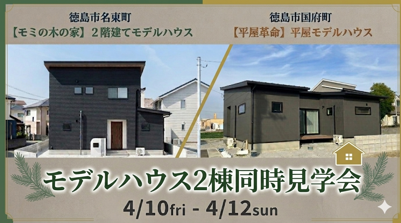 「家族の繋がりを大切にしたい」「無駄のない動線で暮らしたい」……住まいへの理想は人それぞれ。 今回は、徳島市内の2つのエリアで、全く異なるコンセプトを持つモデルハウスを同時にご見学いただけます。 木の香りに包まれる心地よい2階建てか、ワンフロアで完結する賢い平屋か。 ご家族のライフスタイルにぴったりの住まいを、ぜひこの機会に体感して見つけ出してください!
